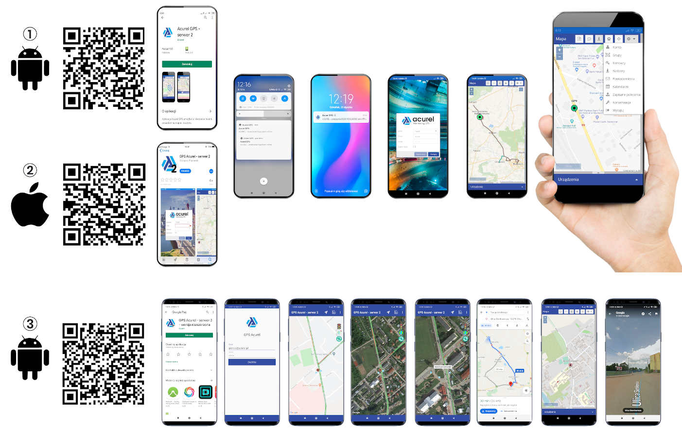 Wystarczy wejść do aplikacji tych obu sklepów i wpisać 'GPS Acurel' lub zeskanować poniższy kod QR bądź ten dostępny w polskiej instrukcji do platformy GPS Acurel.