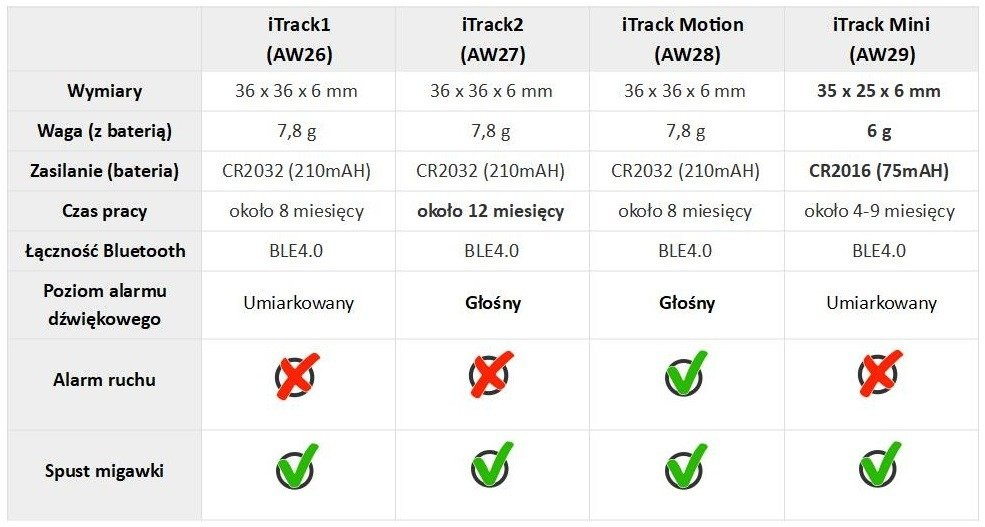 Wybór odpowiedniego modelu lokalizatora Bluetooth ułatwi poniższa tabela: